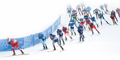 图为2月19日,参赛选手在越野滑雪男子50公里集体出发(自由技术)比赛中。受天气影响,赛程缩短为30公里。