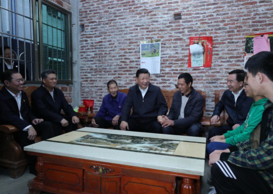 2018年10月22日至25日,中共中央总书记、国家主席、中央军委主席习近平在广东考察。这是10月23日下午,习近平在英德市连江口镇连樟村贫困户陆奕和家,同他们亲切地拉家常。新华社记者 鞠鹏 摄