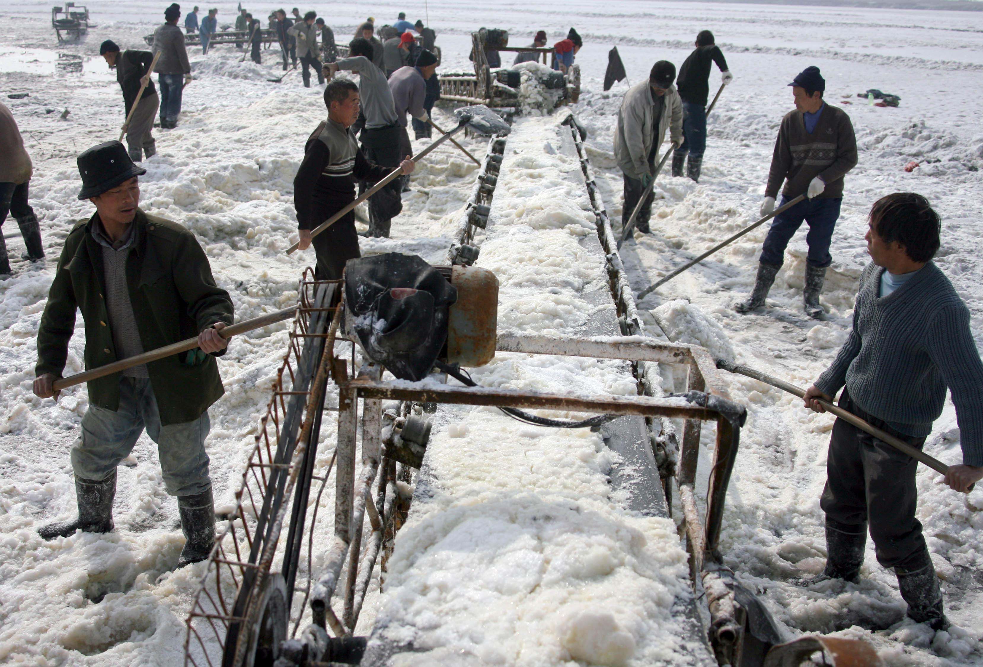 2016年8月25日,工人在运城盐湖进行扒盐作业。