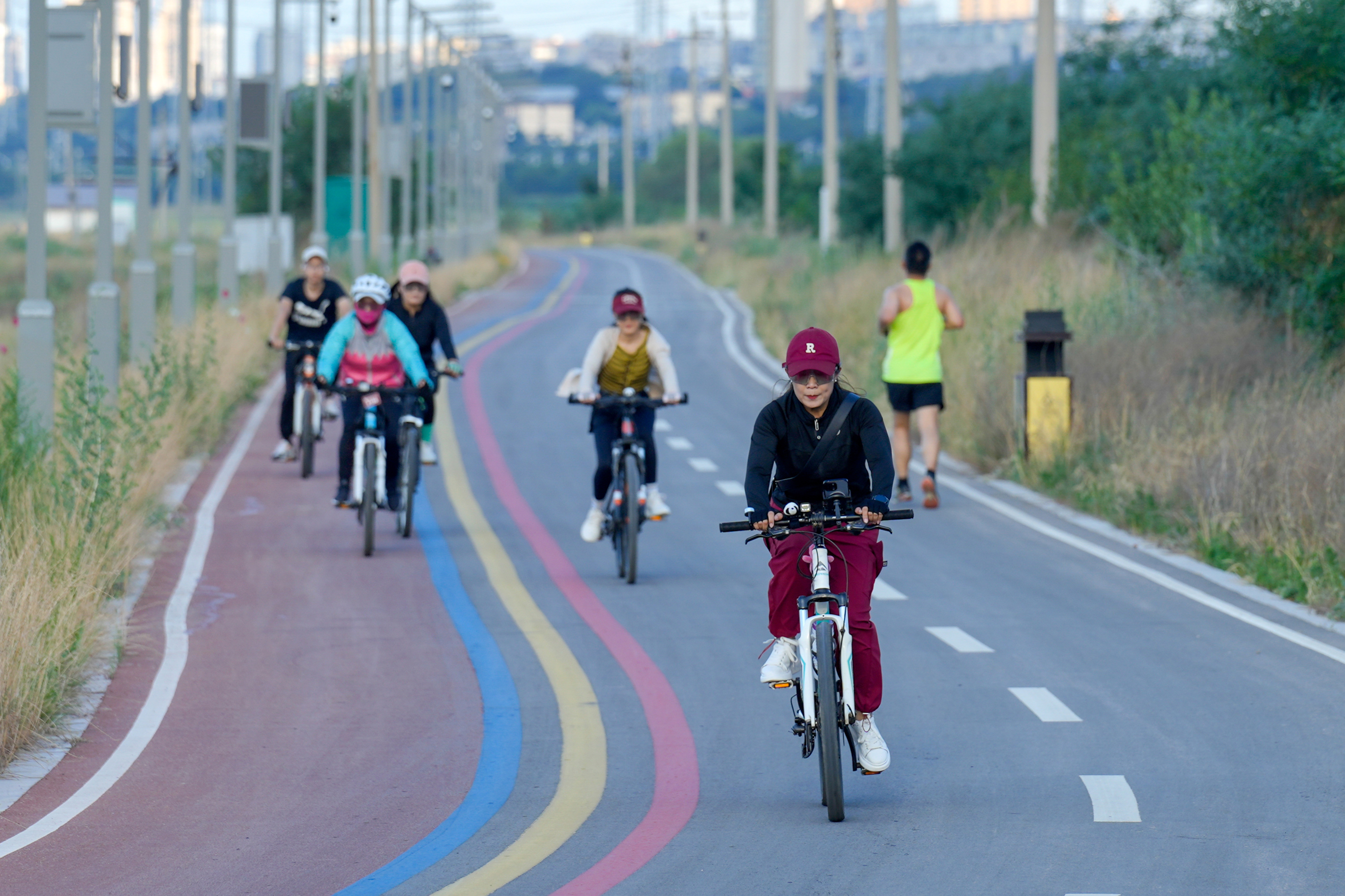 2024年6月5日,人们在运城盐湖环湖步道上骑行。