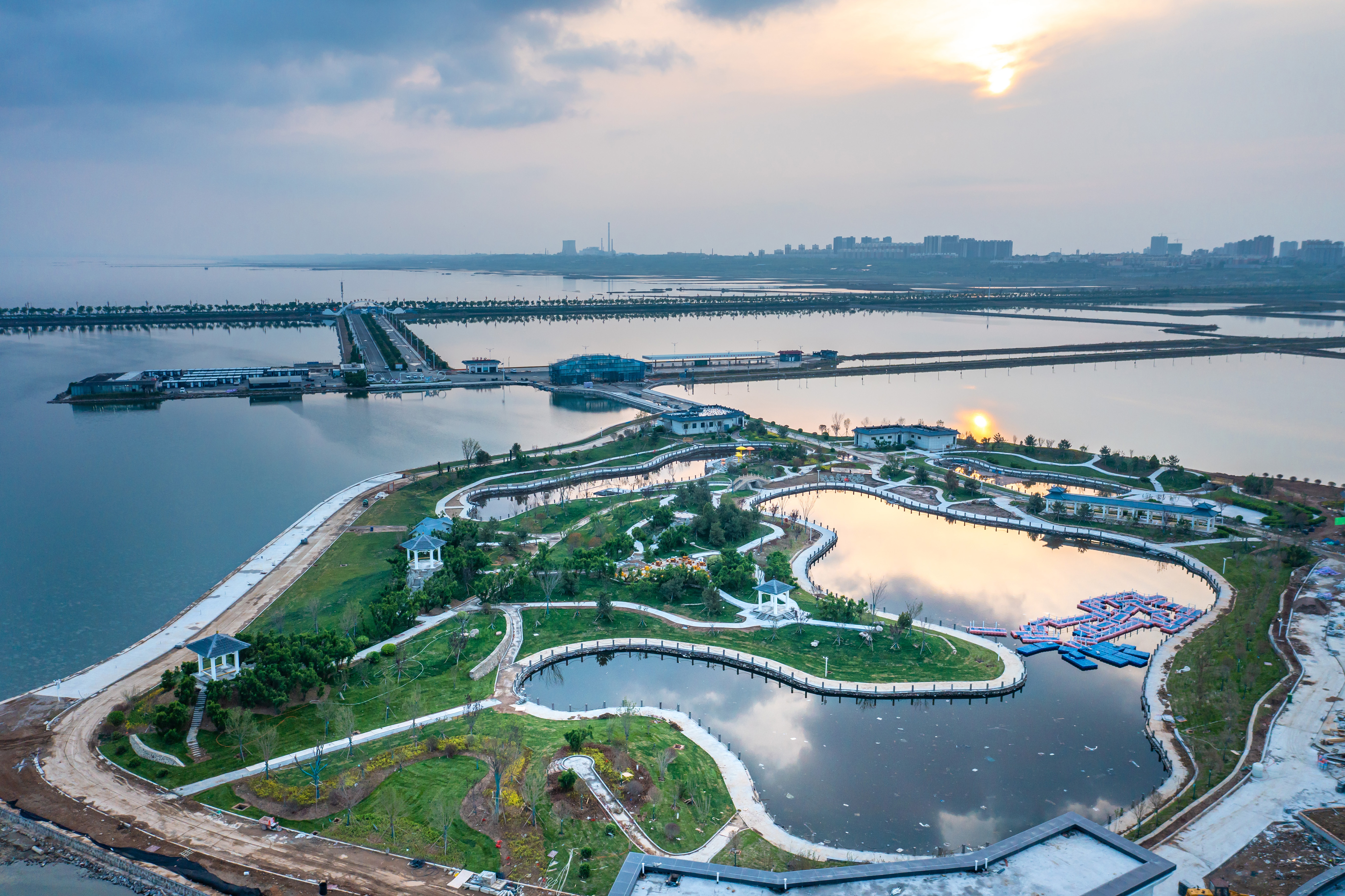 2024年4月14日拍摄的运城盐湖全面提升改造项目现场(无人机照片)。该项目是运城盐湖生态治理及基础设施配套工程,旨在打造集吃、住、行、游、购、娱于一体的精品旅游度假综合体,助推文旅产业转型升级和融合发展。