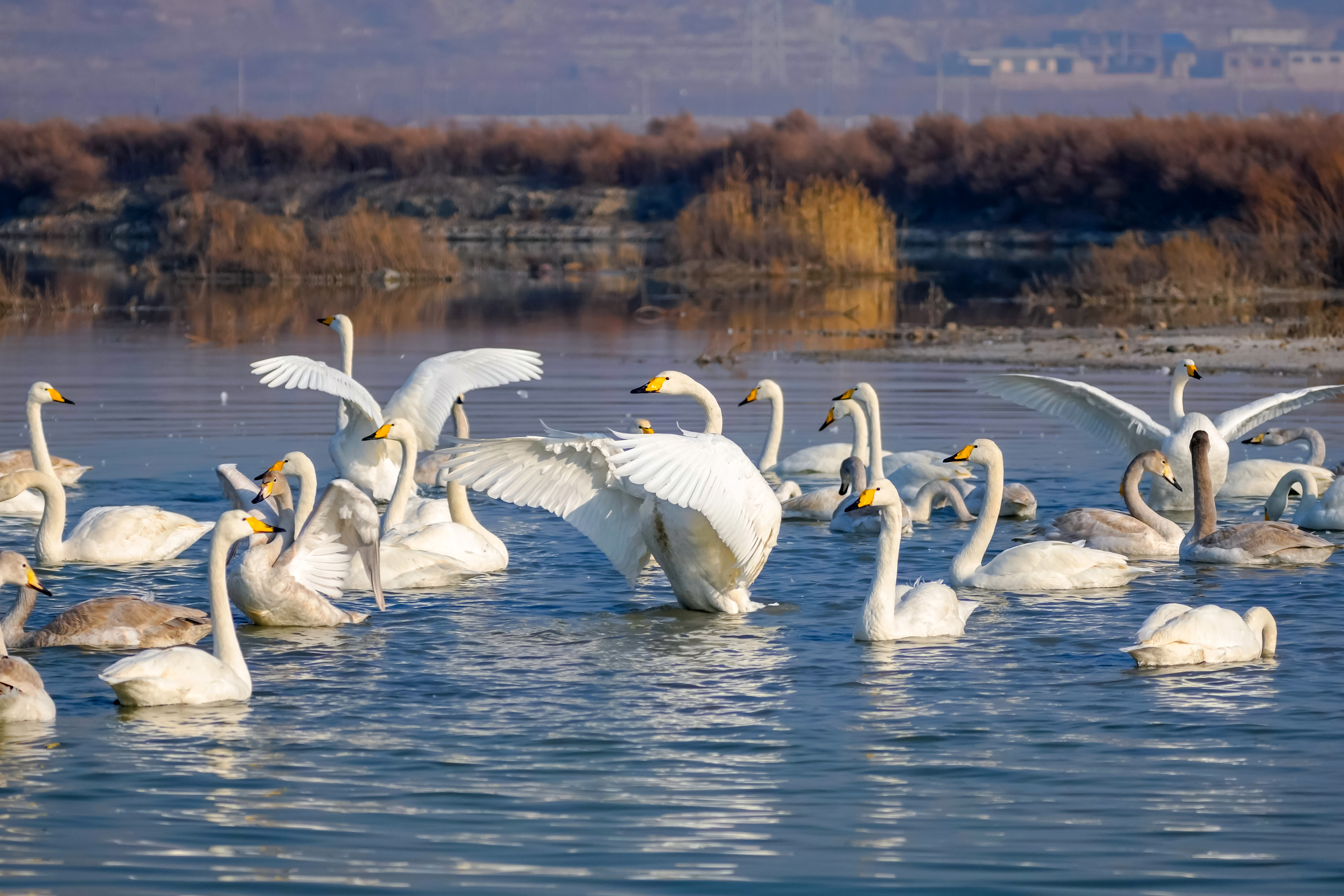 2024年1月5日,白天鹅在运城盐湖嬉戏。