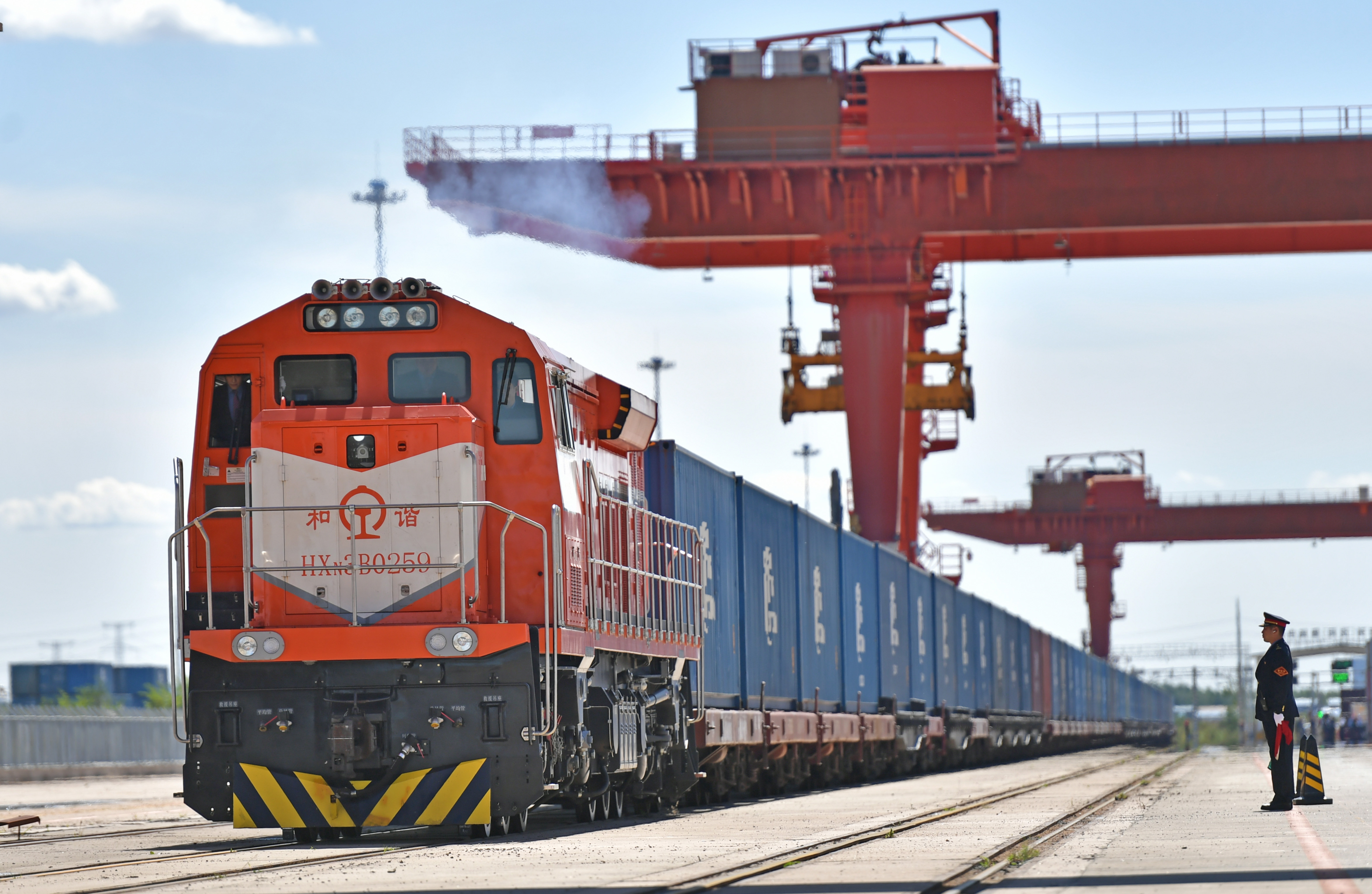 2023年9月20日,一列中欧班列行驶在内蒙古满洲里站货运车间集装箱场。作为我国向北开放的“桥头堡”、中欧班列“东通道”的重要口岸,满洲里铁路口岸不断加大中欧班列通道能力建设,进一步提升运输效率和品质。