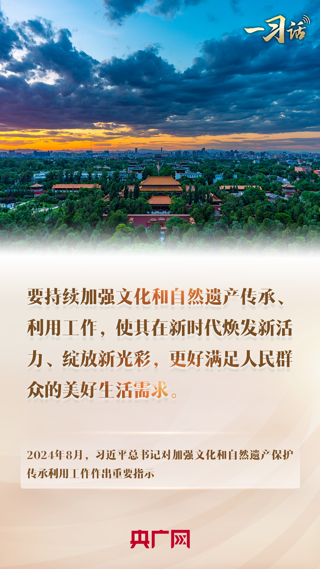 “守护好中华民族的文化瑰宝和自然珍宝”。前不久,习近平总书记对“北京中轴线”“巴丹吉林沙漠-沙山湖泊群”“中国黄(渤)海候鸟栖息地(第二期)”等三个项目申遗成功作出重要指示,要求“持续加强文化和自然遗产传承、利用工作,使其在新时代焕发新活力、绽放新光彩,更好满足人民群众的美好生活需求。”