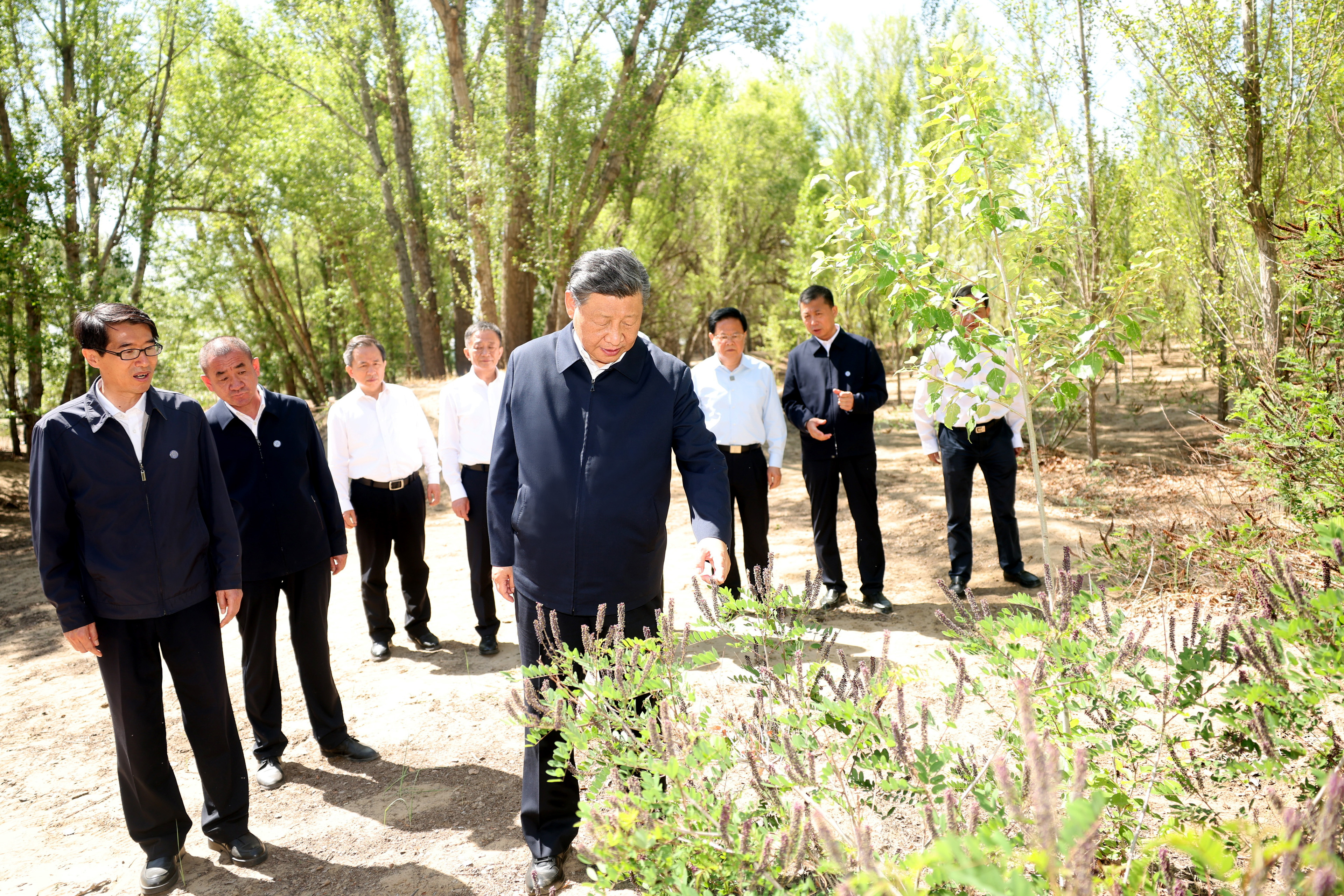 2023年6月5日至6日,习近平在内蒙古巴彦淖尔考察,并主持召开加强荒漠化综合防治和推进“三北”等重点生态工程建设座谈会。这是6日上午,习近平在临河区国营新华林场考察。