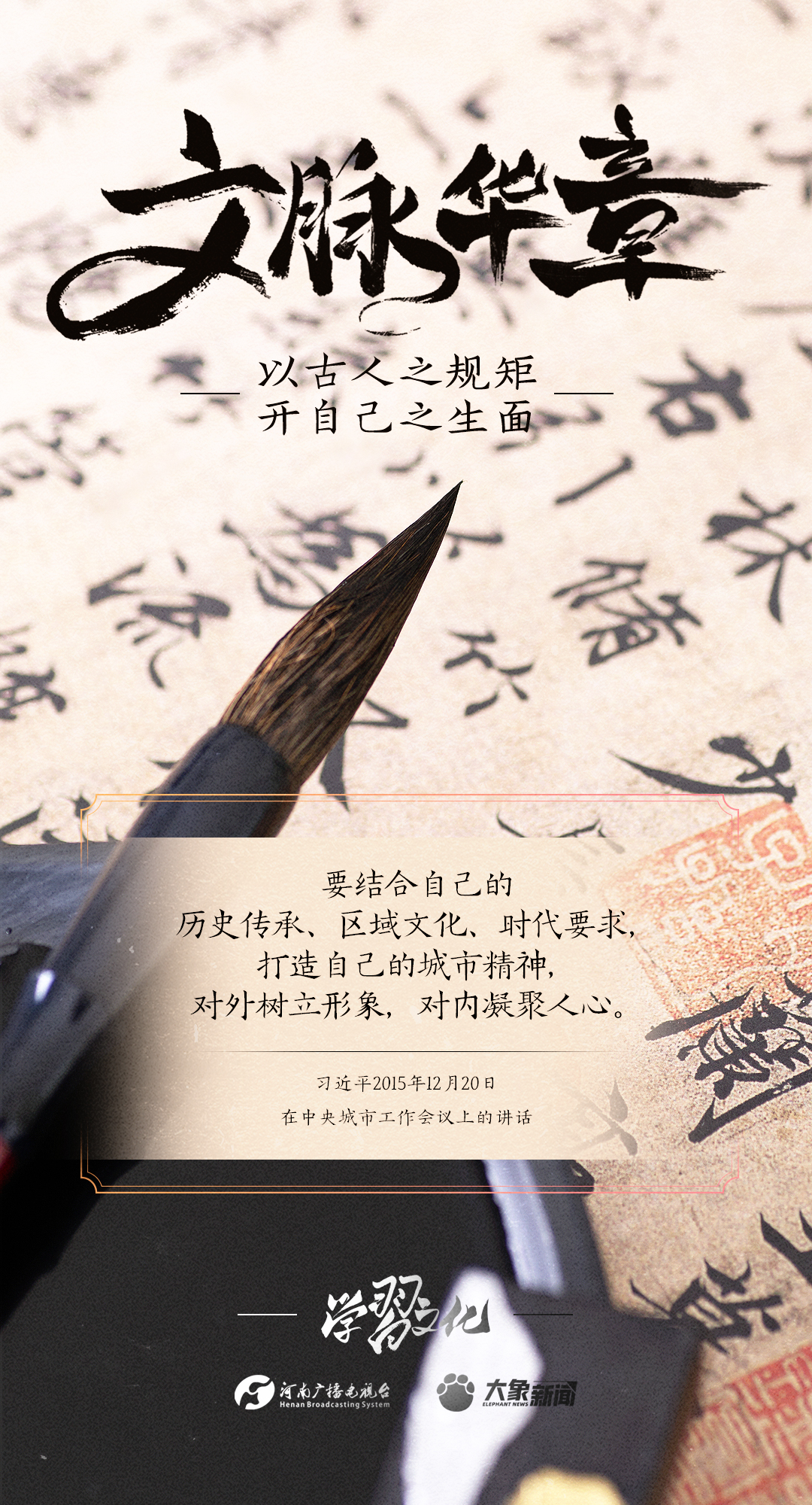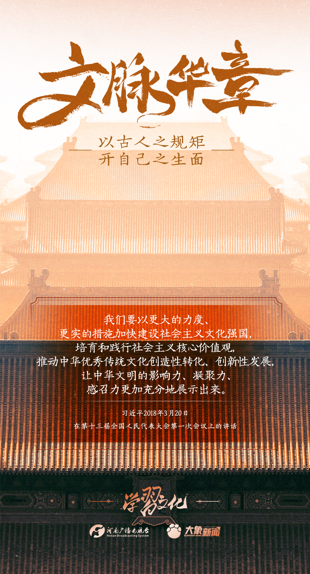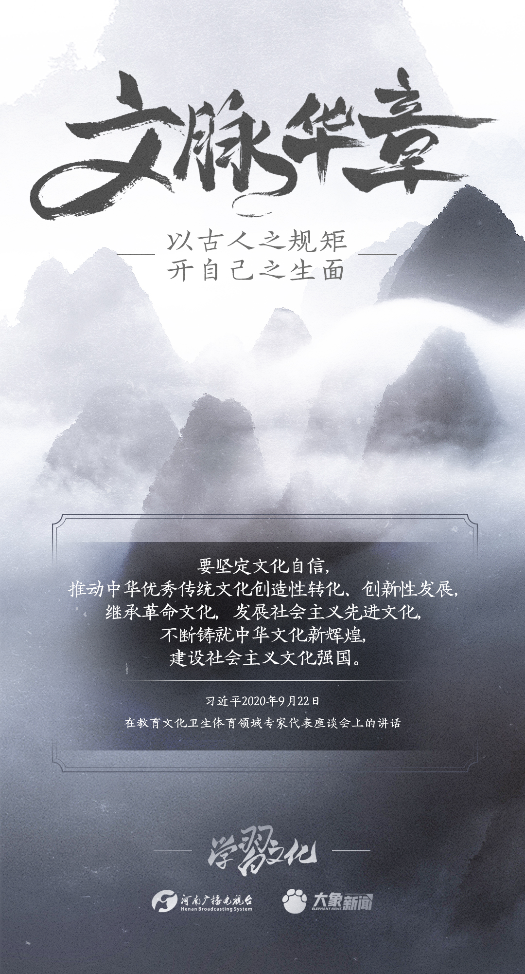 2014年10月15日,习近平总书记在文艺工作座谈会上的重要讲话指出:传承中华文化,绝不是简单复古,也不是盲目排外,而是古为今用、洋为中用,辩证取舍、推陈出新,摒弃消极因素,继承积极思想,“以古人之规矩,开自己之生面”,实现中华文化的创造性转化和创新性发展。