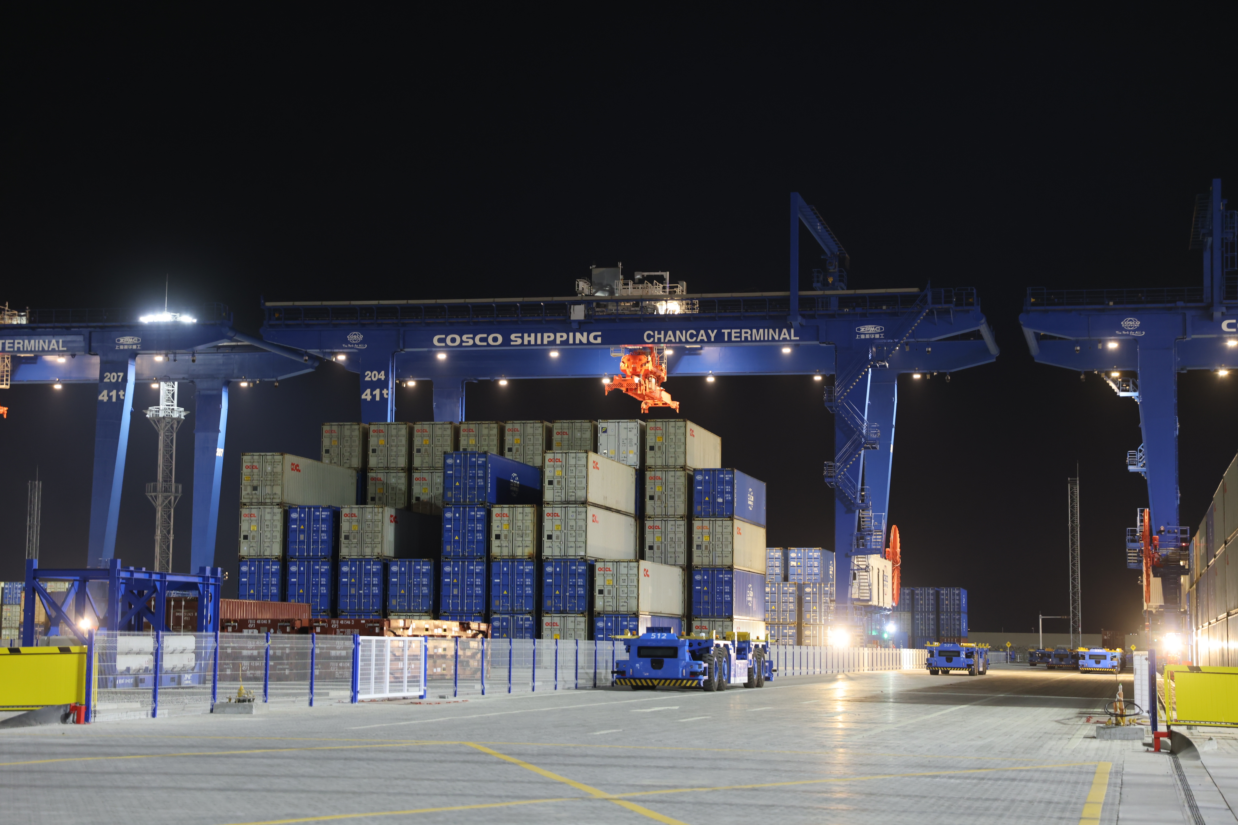 通过大屏幕连线,两国元首共同下达开港指令。利马以北80公里的钱凯港,在夜幕中开启了港口作业。