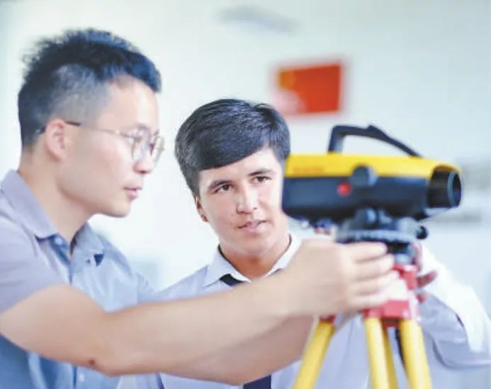 在塔吉克斯坦首都杜尚别的鲁班工坊,来自天津城市建设管理职业技术学院的老师(左)为当地学生提供指导。新华社记者 郑开君 摄